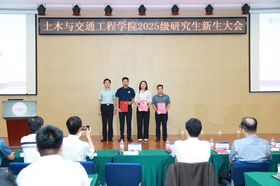 博士生导师代表马超教授发言,他谈到研究生阶段是从知识接受者向探索者和创造者的关键转变,愿各位在科研道路上坚定初心、锤炼真知,最终学有所成。21级博士生代表刘兴奇,25 级博士新生(2+3 硕博连读)代表吴梦琳和25 级硕士新生代表高洋洋先后发言:刘兴奇结合自身科研经历,寄语学弟学妹勇于探索;吴梦琳与高洋洋则表达了对研究生生涯的期待与奋斗决心,其中高洋洋以 “博学而有智慧” 为目标,引用导师诗作《路》,彰显了新一代土木人的初心与担当。
