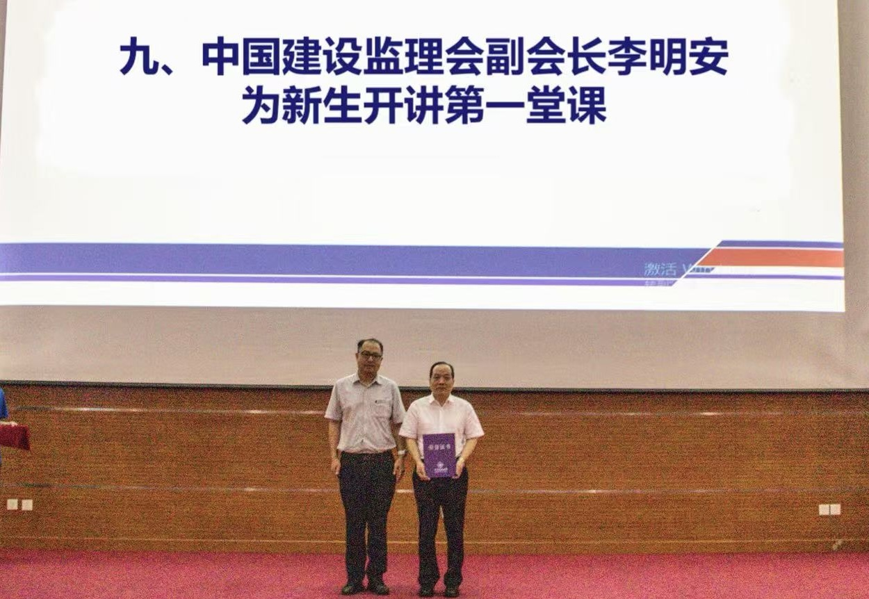 中国建设监理协会副会长兼秘书长李明安为2025级新生讲授以《土木工程发展与思考》为题的开学第一课,他结合上天入地下海等各类工程实例,深入且生动地展开讲解,引导全体新生增强专业认知,树立行业自信。这场分享深入浅出、精彩纷呈,既有对工程实践的深刻洞察,又有对行业前沿的精准把握,为同学们打开了土木工程领域的全新视野,赢得了现场同学们的阵阵热烈掌声,让大家受益匪浅、备受鼓舞。