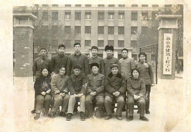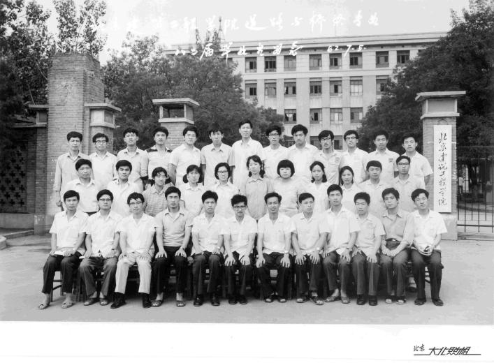 1975年1月建71-04班毕业时部分同学和建工系领导、老师在校门合影 |