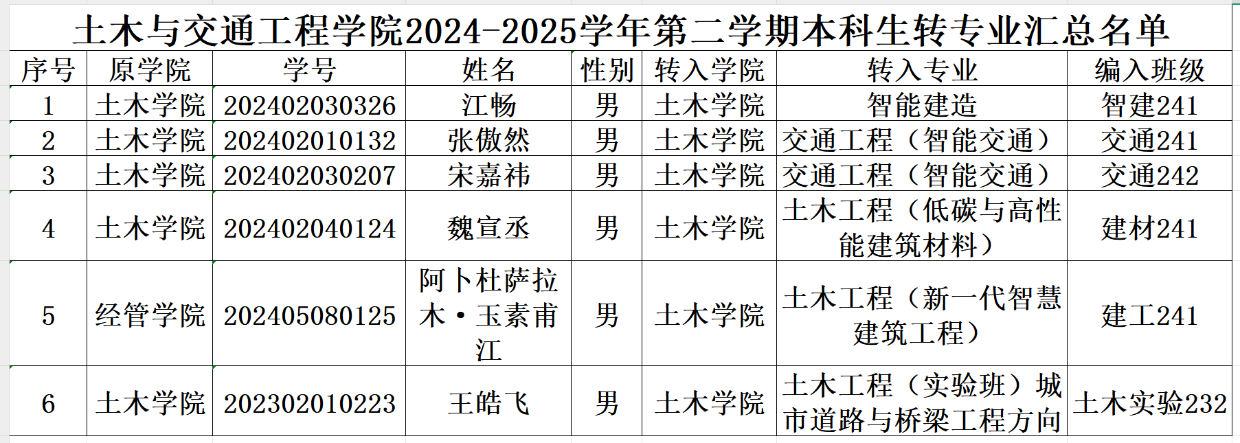 根据2024-2025学年第二学期关于本科生转专业工作的通知,和《北京建筑大学本科学生转专业实施办法》文件精神,我院组织开展了本科生转专业工作。经学生申请,学生所在斗地主电脑版 审核,我院转专业考核小组考核,土木斗地主电脑版 第一志愿录取接收6名转专业学生,公示如下: