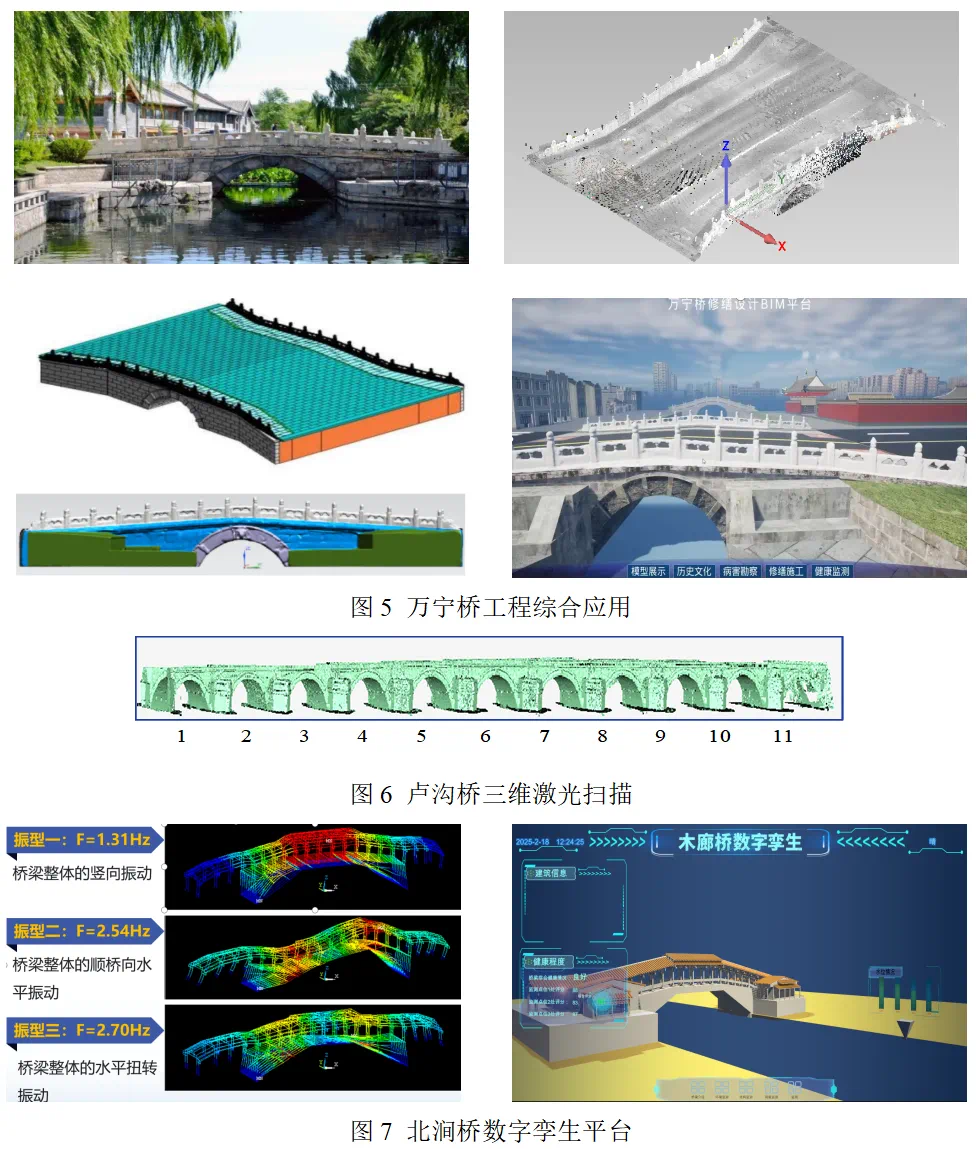 为更好地服务北京中轴线上的古桥保护、开放与新生,斗地主电脑版 师生综合运用三维激光扫描、雷达探测和超声波探测等多种无损检测方法,获取了详尽的桥梁结构和材质数据,通过与建筑信息模型、多尺度数值模拟等技术结合,研发形成了“原真性修复—数字化存档—预防性保护”于一体的古桥结构智能检测技术。在此基础上,斗地主电脑版 还搭建了古桥修缮保护数字管理平台,实现了古桥高保真动态可视化展示。相关技术成功用于有着700余年历史的北京万宁桥、北京市现存最古老的石造联拱桥—卢沟桥等遗产保护项目,并已推广至浙江泰顺北涧桥等工程,使古桥在现代科技助力下修缮焕新生。