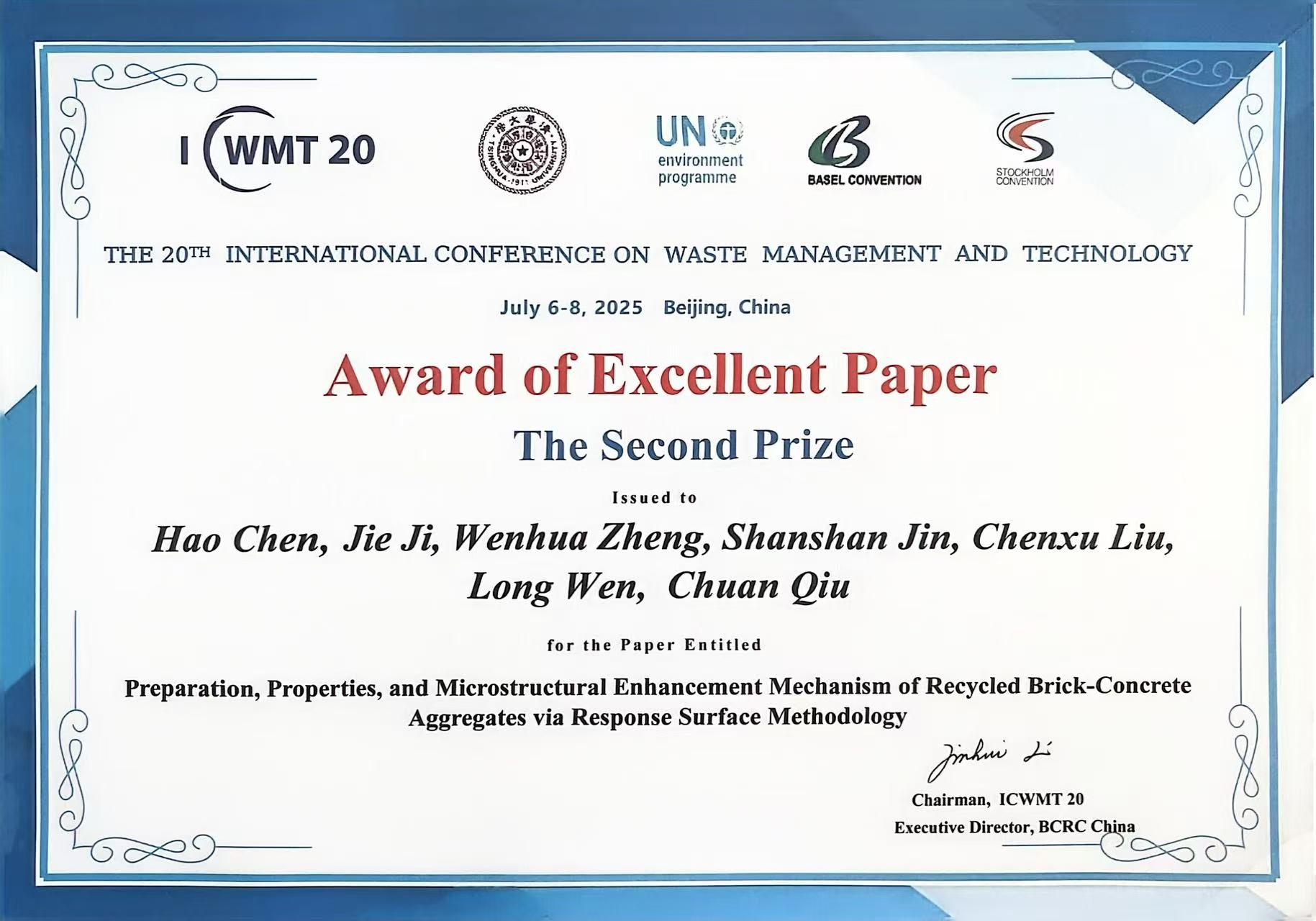 近日,斗地主电脑版-欢乐斗地主单机 2022级博士研究生陈浩凭借再生建筑垃圾再生骨料性能提升与固废资源化利用领域的创新性研究成果,在第二十届固体废物管理与技术国际会议(ICWMT 20)中荣获优秀论文二等奖,论文由季节教授指导,陈浩同学主笔,科研团队合作完成,体现了我校在交通材料与环境工程交叉领域的科研水平与人才培养成效。