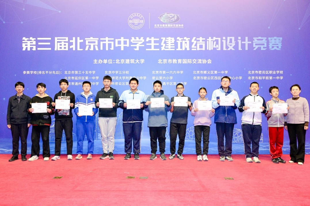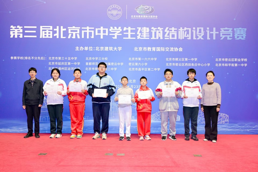 11月23日,由北京建筑大学、北京市教育国际交流协会共同主办的第三届北京市中学生结构设计竞赛,在北京建筑大学大兴校区成功举办。本届赛事共吸引了来自北京中学三分校、北京市第三十五中学等13所中小学的21支参赛队伍,共百余名师生参加。